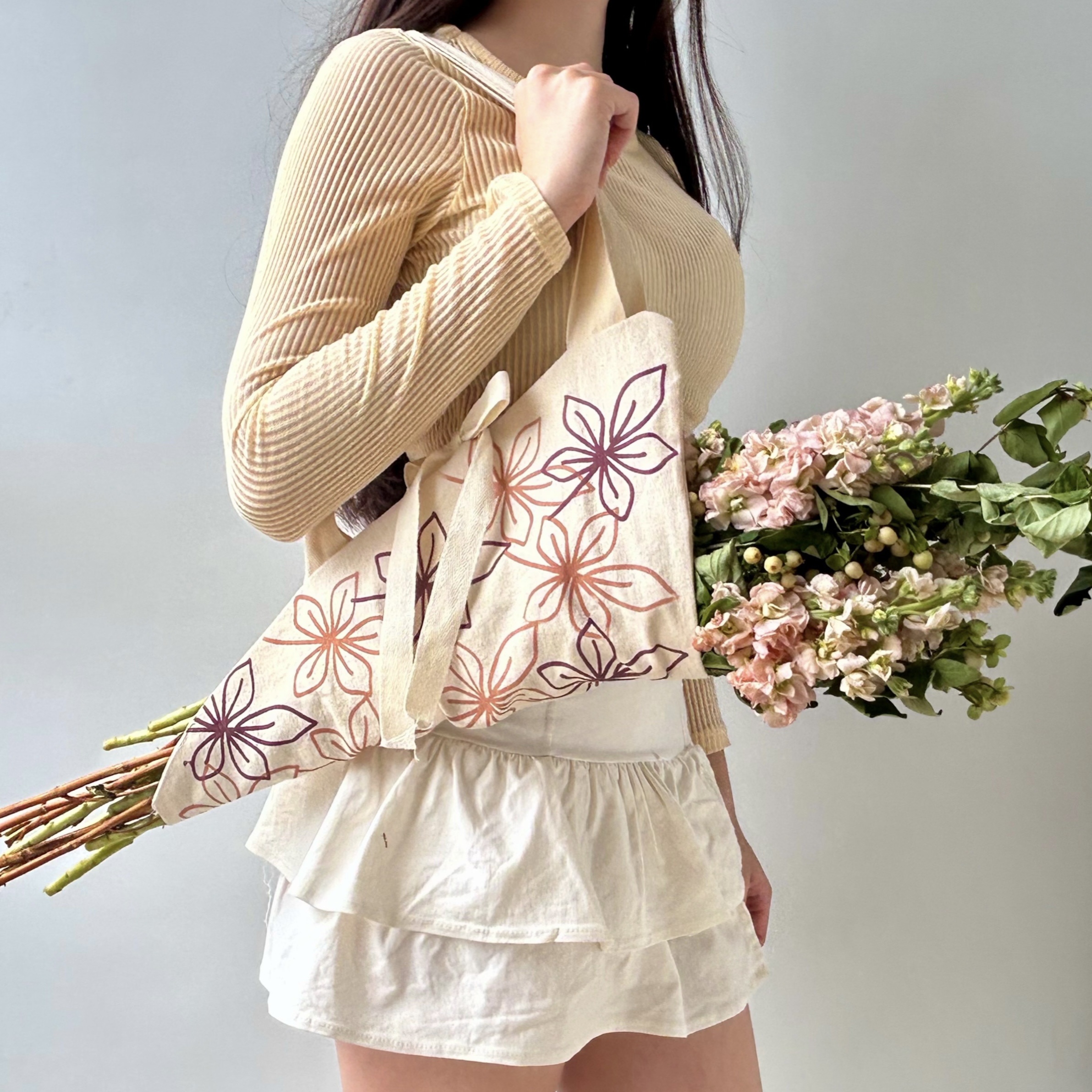 Un estuche textil tipo bolso que porta flores y viste el florero cuando llegas a casa. Cada bolso llega con una tarjeta QR para una meditación